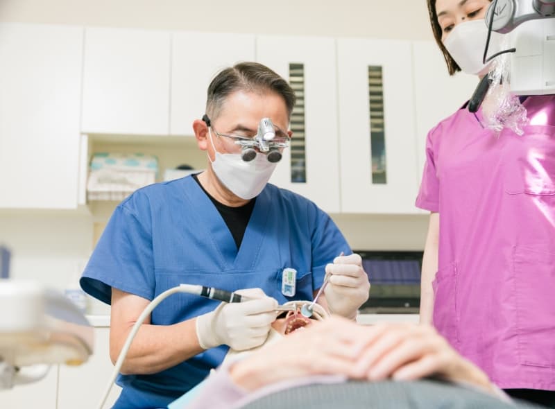 歯周病治療の目的は、原因となる細菌(プラークと歯石)の徹底的な除去と、患者さまによるセルフケアの改善です。軽度な場合は、ブラッシング指導と専用器具による歯の表面・歯周ポケット内の歯石除去(スケーリング)が中心となります。中等度以上に進行し、深いポケットができた場合は、麻酔下で歯肉の奥の根面をきれいにするルートプレーニングが必要です。