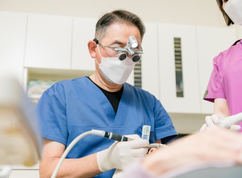当院では、すべての治療において必ず「拡大鏡(ルーペ)」を装着して診療を行っています。肉眼では見落としがちな微細なむし歯や歯の亀裂、詰め物の僅かな段差も、拡大視野であれば明確に捉えることができます。常に拡大された状態で処置を行うことで、健康な歯を削りすぎない丁寧な治療と、長持ちする精密な仕上がりを実現します。
