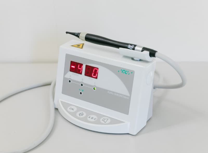 当院では、レーザー光を用いてむし歯の進行度を数値化するむし歯検出装置「ダイアグノデント」を導入しています。肉眼やレントゲンでは発見が難しい、歯の溝の奥に隠れた初期のむし歯も、レーザーを当てるだけで正確に検知可能です。痛みは全くありません。数値によって「今すぐ削る必要があるか」を客観的に判断できるため、削る必要のない歯への過剰な治療を防ぎ、患者さまの大切な歯を最大限に残すことができます。